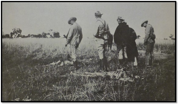 The ’96 Rebellions: Officers examine the remains of assistant N.C. Graham, Sub-Inspector C Handley, Tpr Case, Corke and Hurford killed near Inyati on 26 March 1896