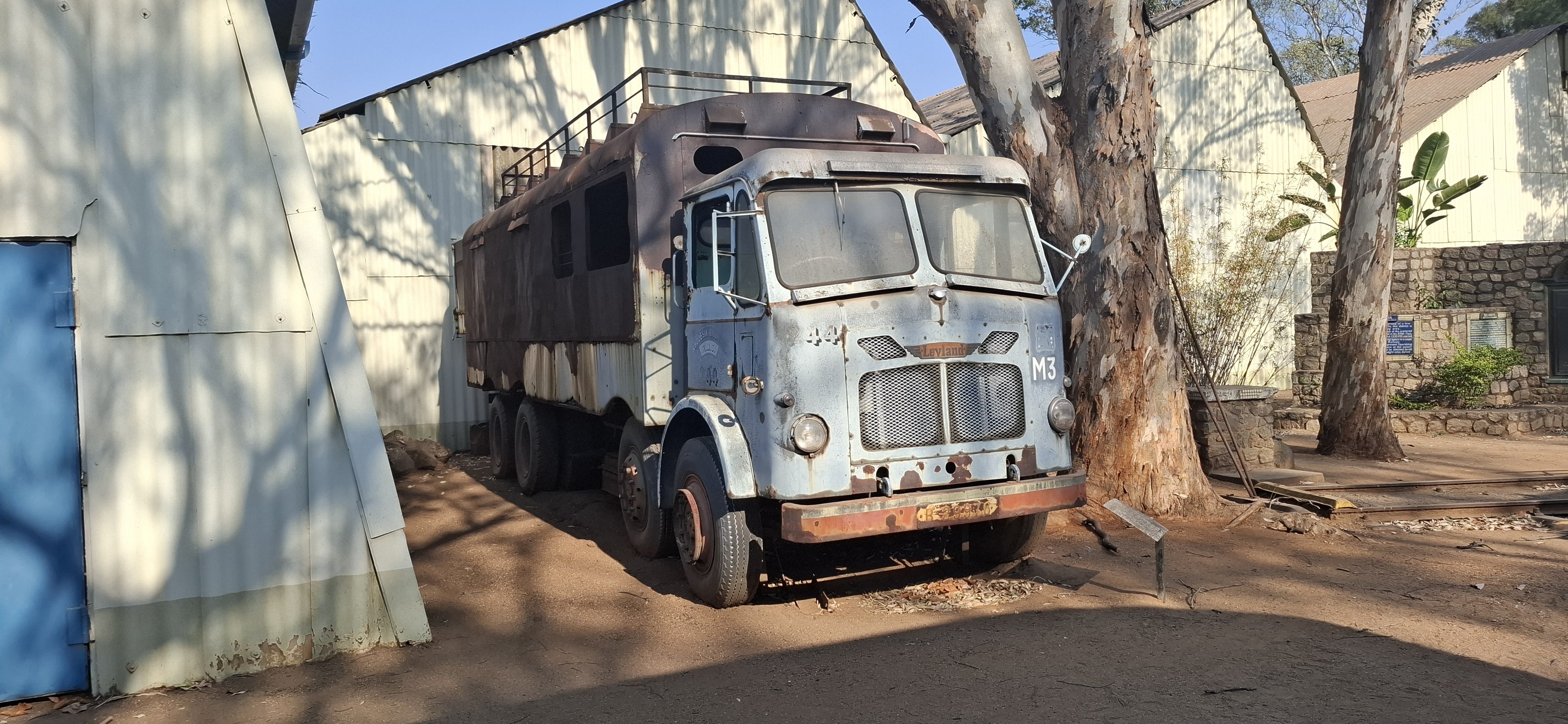 Built locally in the late 1970's and capable of carrying 35 police, railway security or soldiers and powered by a Leyland 680 diesel engine. Intended as an armoured escort vehicle for passenger trains the armour proved too heavy for the engine and it was rarely used. Used once again in Mozmbique's civil war it was found underpowered again and unsuitable. Discarded and parked at the Bulawayo railway workshops, it was donated to the Museum and has been partially restored. Here seen hitched to a Garrett Locomotive No 411