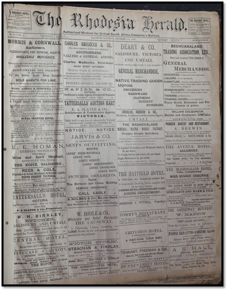 The four pages of ‘News and Advertisements’ sold for 6d and it was a strange, if useful production. A line under the main heading of the front page of the issue of 17 September read: “Issued pending completion of arrangements for the printing of the forthcoming Rhodesia Herald.
