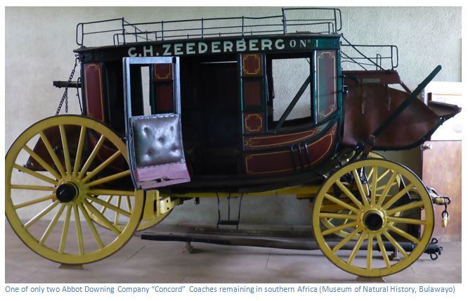 Zeederberg’s bought other coaches in South Arica, and also imported four Concord coaches directly from the Abbot Downing Company in the USA, but none appeared to have survived. One was written off in an accident and two were burnt by an amaNdebele Impi in 1896 between Gwelo (now Gweru) and Bulawayo.