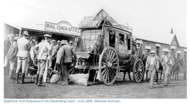 In 1896, most (>90%) of trek oxen fell victim to the severe rinderpest epidemic that swept across southern Africa. During the Matabele Rebellion, which began in March 1896, Zeederberg coaches were the sole means of transportation between Bulawayo and the outlying settlements, and even went as far as Pietersburg for supplies for the local Volunteer and the Imperial Forces . One coach, with nine passengers, was attacked in a running fight between Shangani and Bulawayo. The mules were eventually run to a standstill and were killed. The driver and passengers ran to the top of a nearby kopje and prepared to defend themselves. With night coming on their situation was bad, but they were saved by the timely arrival of a patrol under Col. Napier on its way to Gwelo (now Gweru) The coach, however, had been burned to ashes.