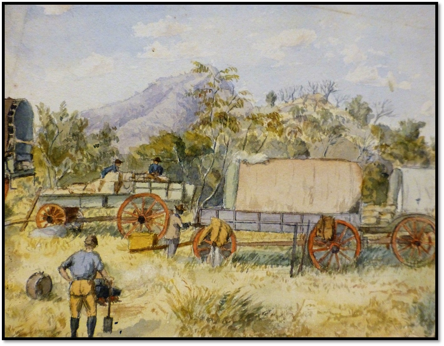 NAZ - Pennefather original watercolour of Pioneer Column ox-wagons in laager near Setoutse’s Hill