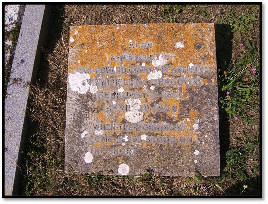 A memorial stone near his mother’s grave at Wyke Regis, Dorset reads: “.”Also in memory Of Lt-Col Edward Graham Pennefather 6th Inniskilling Dragoons February 12, 1850 - April 29, 1928. When the morning was come Jesus stood on the shore.”