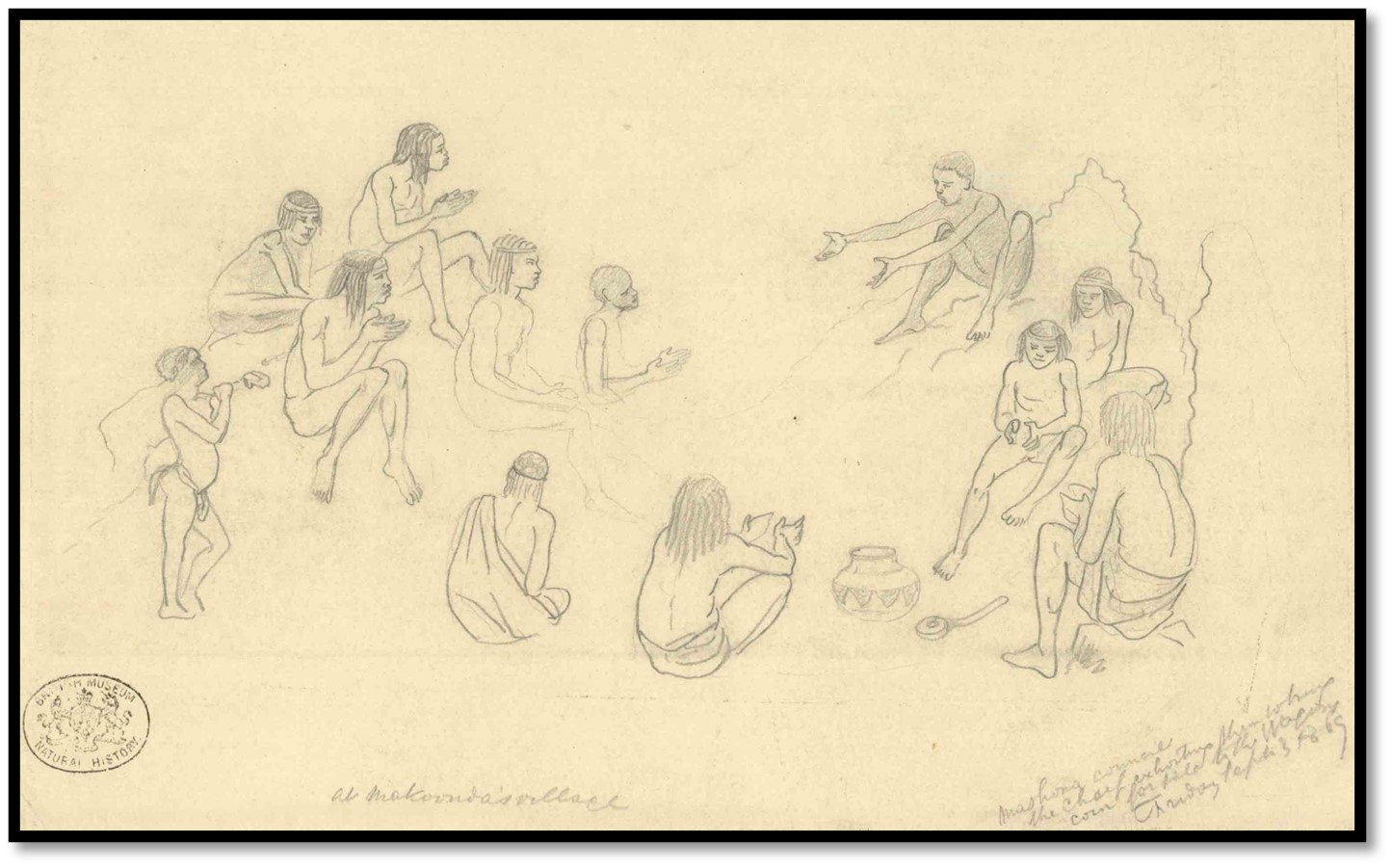 Natural History Museum (London) Baines Collection No. 21: At Amakoonda’s village a Mashona council where the chief is persuading the people to bring corn for barter at the expedition wagons – 3 September 1869