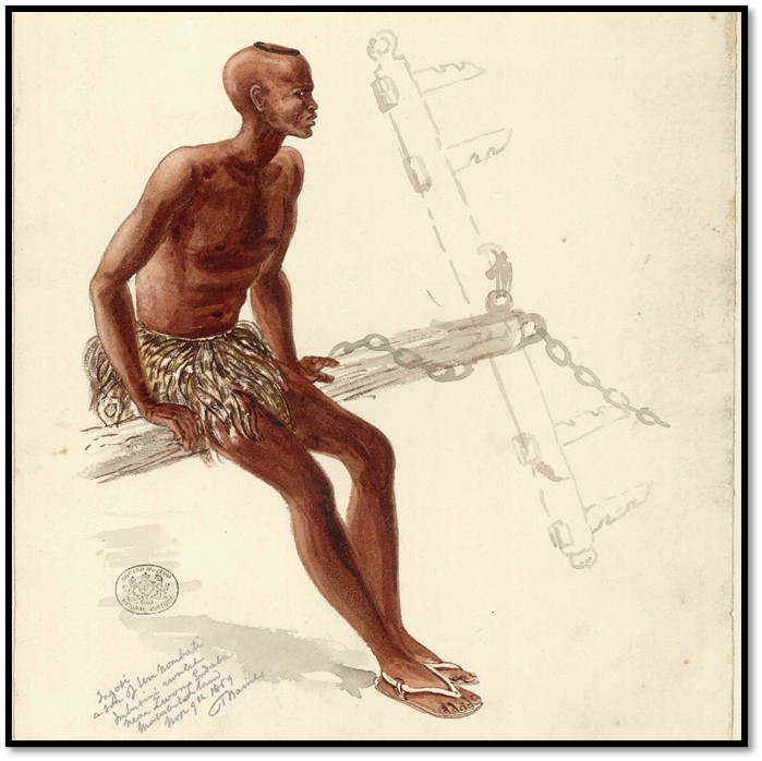 Natural History Museum (London) Baines Collection No. 72: Ingosi, a son of Umnombata (Ncumbata) at Umbusini rivulet near Zwangendaba – 9 November 1869