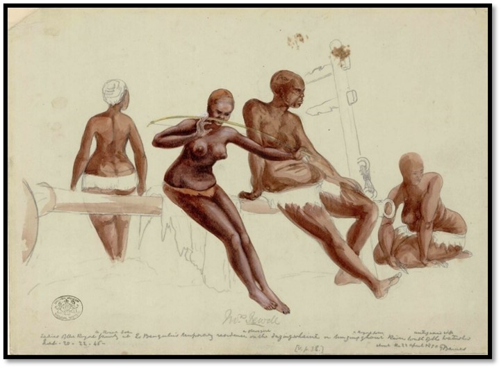 Natural History Museum (London) Baines Collection No 82: Ladies of the Royal family at Nobengulu’s temporary residence Inzingwhaine [Umzingwane] river (Left to Right) Royal sister, slave girl, Royal sister, Umtigan’s wife – 25 April 1870