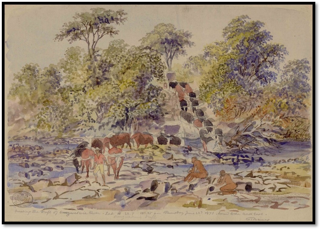 Natural History Museum (London) Baines Collection No. 39: Crossing the Umgweswie [Umsweswe] river drift - 22 June 1870