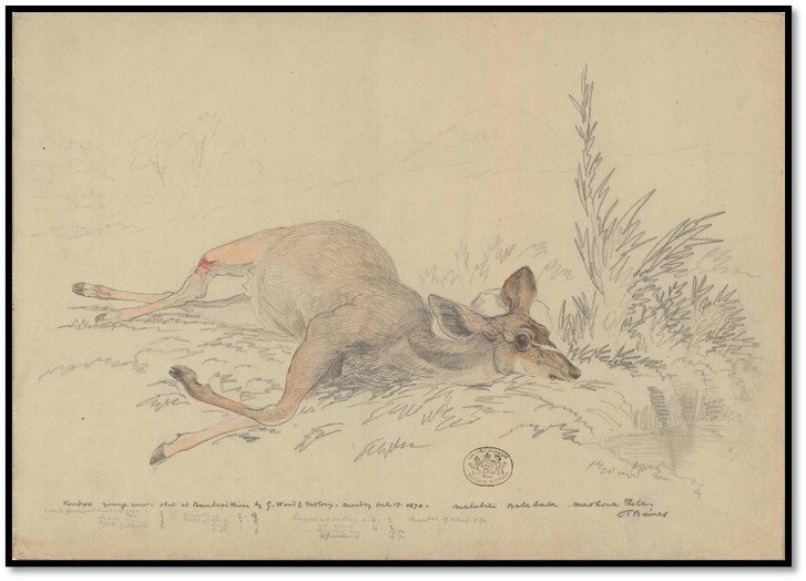 Monday 17 October 1870: “last night a report was brought home that two of the oxen were missing, one a poor one named Fontein, the other a good after-ox of Charlie’s span. Jewell sent extra hands to assist the herdsman in searching for them, but as yet they are not found. Between 7 and 8 the cracking of whips was heard and the waggons of Mr Hartley and the other hunters arrived about breakfast time and George Wood coming on horseback from the right, driving before them a koodoe [kudu] doe which they would have brought right into camp, had she not plunged into the pool of the little rivulet and drowned herself. They kindly gave me time to make a sketch and would have given me the carcase itself had I wished it. It was a young cow which apparently had had one calf and was pregnant with a second and her form seemed the very perfection of beauty and gentleness. Her head was finely tapered, the nose small, the eyebrows broad and the large full liquid eye, although its lustre was dimmed by death, seemed not merely to fill the orbit but actually to swell beyond it. The ears were large and mobile and the whole expression of the countenance was gentleness and timidity. The neck was slender, the legs moderately so, the body moderately rounded, and the udder full of milk. The general colour greyish fawn, slightly warmer in tint on the face and legs and somewhat blueish on the neck.”