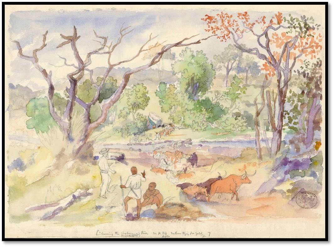 Thursday 23 June 1870: “After breakfast I marked the latitude on a fine Paopisa or Mosuawe tree under which we had slept and Jewell[xvii] took his camera across to a place we had previously marked. The leading waggon was launched down the steep incline and halted on the first channel, the oxen just stretching across the second, below where the water rippled over the rough stones. I had just settled down to get a sketch, but being within range of the camera, I had to sit still during the five minutes of exposure required and make a start to get ahead of the waggons as soon as they were again in motion. However, I have one advantage over the photographer, i.e. that I can finish my picture at another time.”