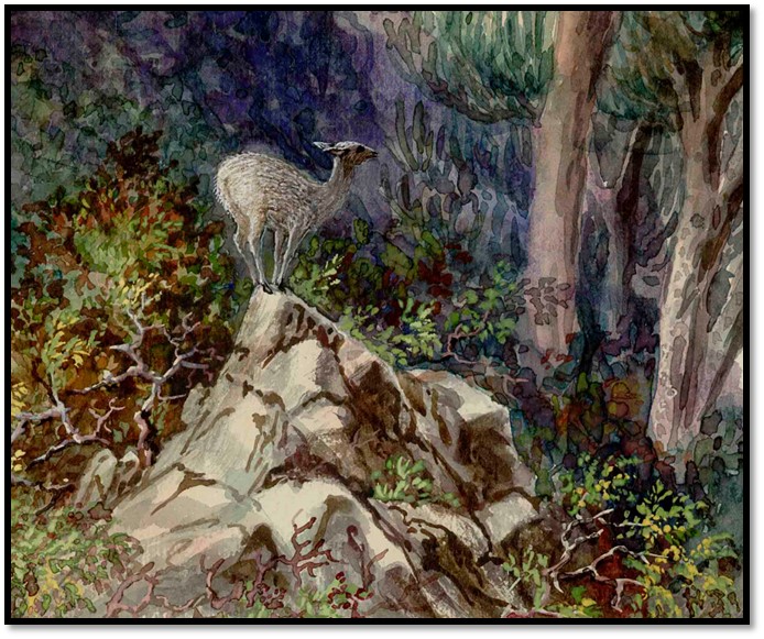 Natural History Museum (London) Baines Collection No. 17: Klipspringer (Oreotragus oreotragus) at the base of a kopje with the ruined walls of a former Mashona village on the Salagozaan or Sarua (Saruwe) river – 27 August 1869