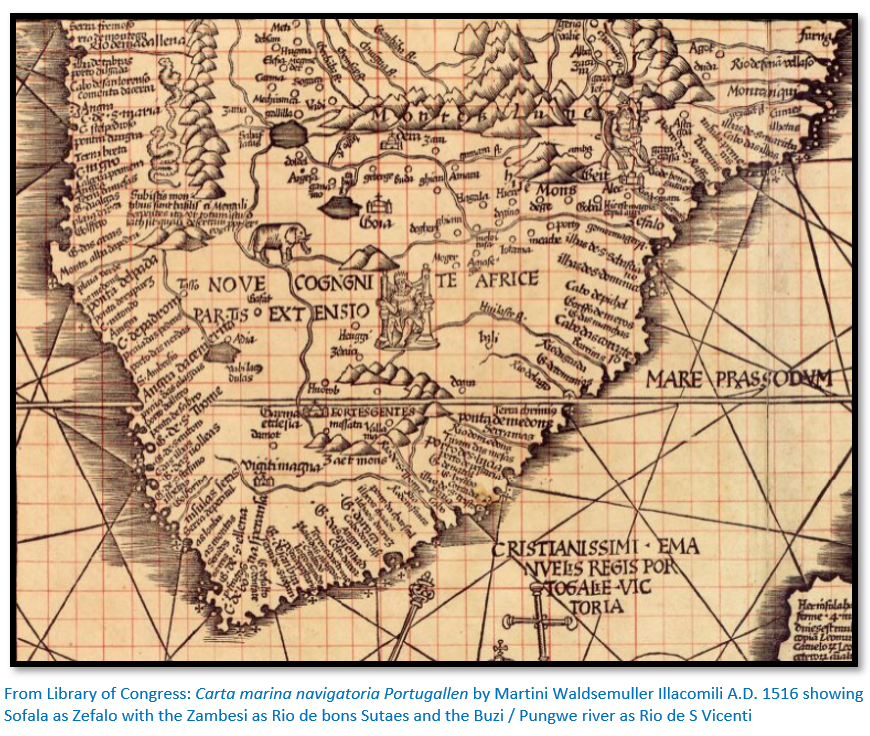 This southern route may have been recommended by Fernandes’ on the grounds that the Revue river, a major tributary of the Buzi river, was controlled by a hostile chief Inyamunda[vii] and it was safer, though longer in distance. It appears that the route along the Zambesi river (Cuama) was only contemplated in 1516 after Fernandes’ third journey to Mutapa when a later Captain of Sofala, Joao Vaz d’Almada reported that Fernandes had reported another river, the Cuama which flowed into the Indian Ocean forty leagues north of Sofala.[viii]