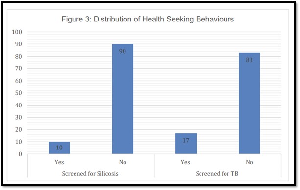 The graph shows that only 10% of ASM were tested for silicosis; 90% had never been screened for silicosis. For TB, 83% of ASM were never screened. Artisanal miners stated that often the nearest health facility was about 8 kilometres away. They had no free time for travelling or walking to health facilities and they were never told about any screening campaigns.[6] Generally they only visited health facilities for HIV related services and to accompany children or wives to ante natal care visits.[7]