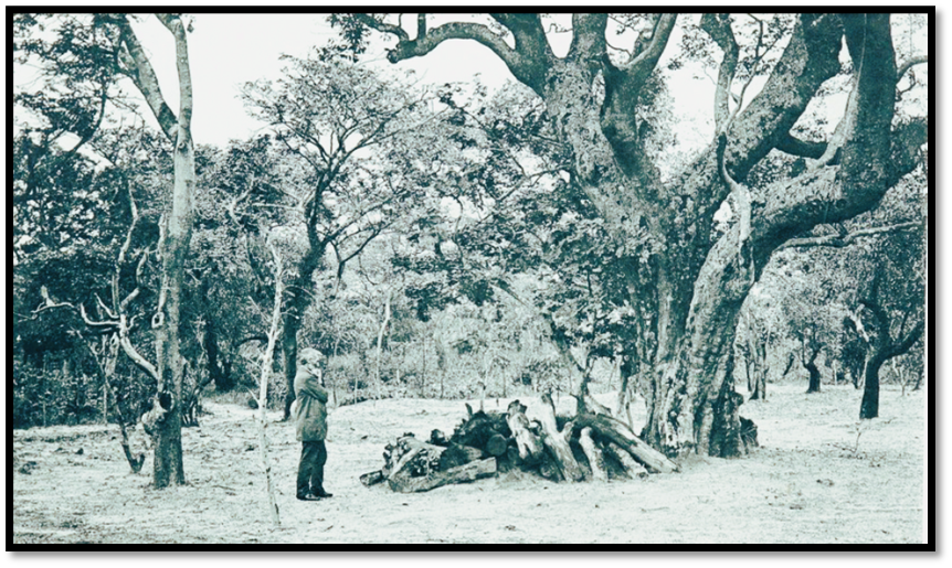 There is nothing remarkable in the scenery as we are still in the Barotse Valley and the banks are only from four to six feet high, while the vast grassy plains stretch out on either side with scarcely a bush to be seen, although now and again we notice a large tree standing solitary and alone, marking the grave of some ancestral chief. On getting opposite any of these, the boatmen ship their paddles, drop on their knees, clap their hands and raising their hands above their heads, shout “Yo sho” (shwilela) to these defunct chiefs - the gods of the Barotse.