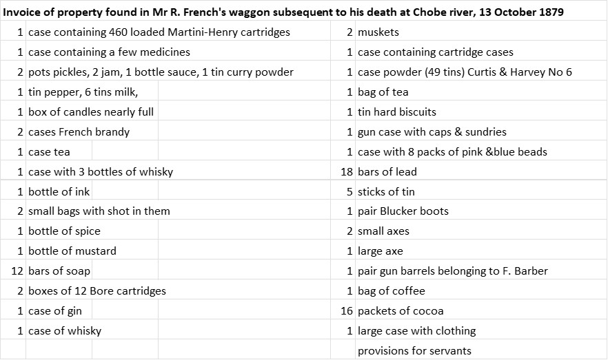 They did make a search for French’s body, but October that year was very hot, Selous was suffering from fever and although a reward was offered, no trace of French was found. Below is the list of French’s personal effects from Selous’ game book made a few weeks after his death and reflects what was usually carried by hunters at the time:
