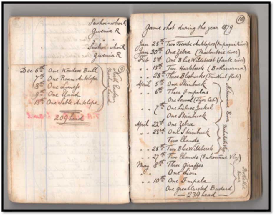 From one end of the original game book that Selous kept between these years are daily details of the animals he shot and until 1880 even their location. In 1881 he missed the winter hunting season as he travelled to England. The daily count continues again from 1882, but without locations being noted and stops after the first few months of 1885 – although he continued to collect game specimens for museums.
