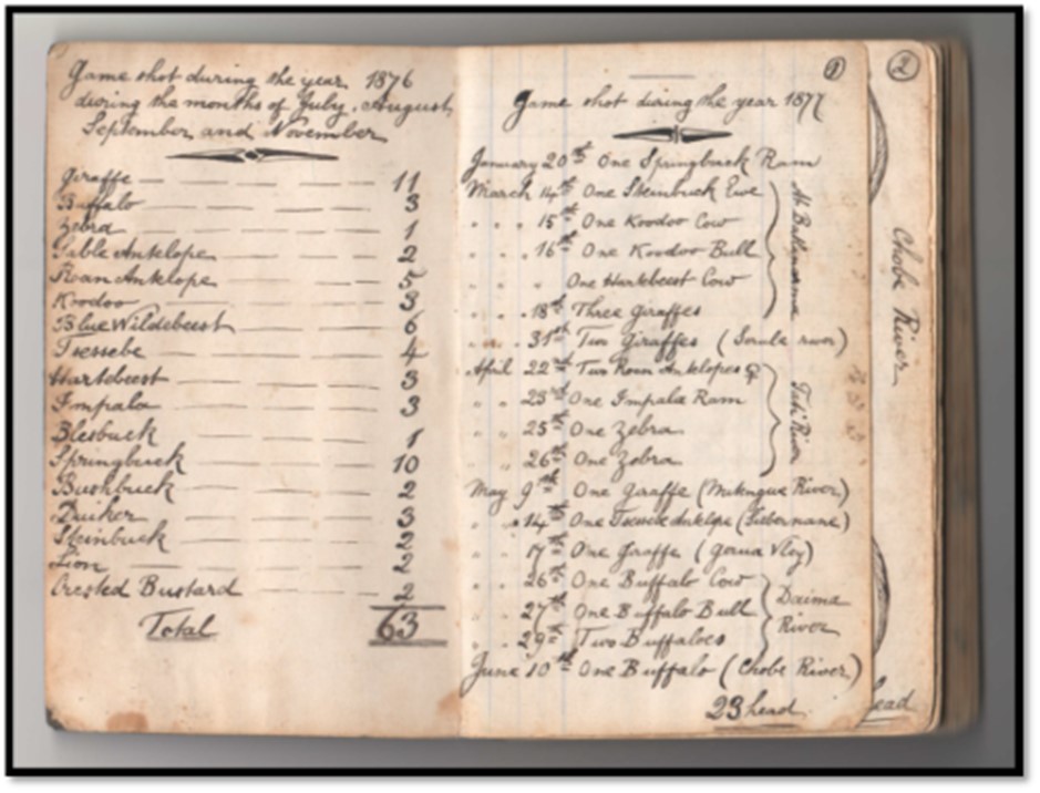 In the preface to A Hunter’s Wanderings in Africa Selous writes: “At the end of the book I have appended some lists kept during my last two hunting expeditions. This has not been done out of any wish to show what a large bag I have made; but it has been copied from my game book, kept carefully from day to day…[iii]