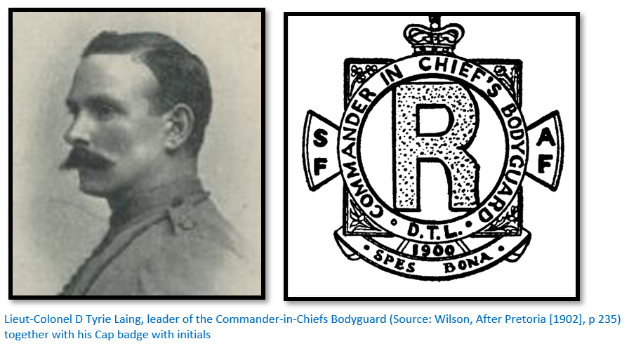 The Corps of Commander in Chief's Bodyguard was raised in Cape Town by Lord Roberts as a personal bodyguard on 31 January 1900 and placed under the command of Tyrie Laing. Initially numbering about 100 men, all of whom were colonials and in the main picked from existing South African 'regular' volunteer units, in November 1900 the unit became a fighting regiment to be called 'The Bodyguard' with a strength of 570. This was soon increased to 1,000 men equipped with two pom-poms and two machine-guns.