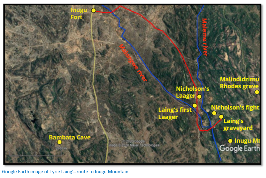 As outlined above Major Tyrie Laing’s mission was to march on Inungu Hill on the 19 July 1896 to outflank the amaNdebele and then on the next day to cut off the retreat of any of Babayan’s forces from the Nkantola Mountain up the Chilili valley.
