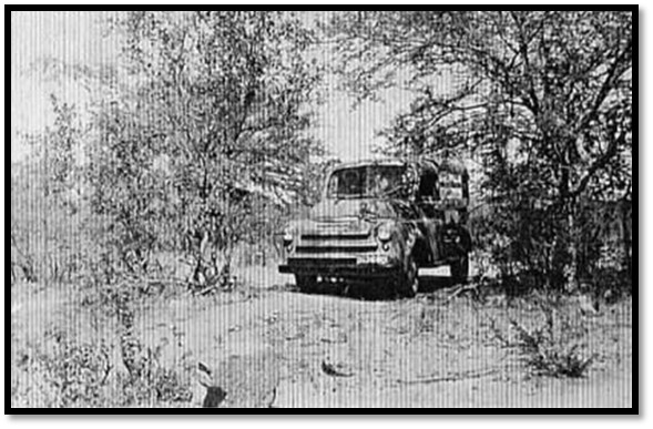 The Shashani river was about 250 feet wide and usually just a dry sandy river bed. To cross the river we broke down its banks and cut loads of thin poles a couple of feet longer than the width of the van and joined together with wire and stretched across the river on top of the sand, and that enabled us to drive over to the other bank, and then drive to the Sun Yet Sen mine, or Legion mine store, and the 6 or 7 Corps on the opposite side of the river. The mat remained on the sand until the rains came, when we rolled it up and kept it ready for the next dry period. When the river flooded, we could, in an absolute emergency, travel on some bush tracks about forty miles to Antelope mine where there was a causeway across the Shashani.