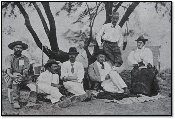 [The third Indaba was held at Fort Usher: present were Sir Richard Martin, Queen Victoria’s representative with an escort of twelve mounted Lancers, Earl Grey, the Administrator, Rhodes, Colenbrander, Rev. D. Carnegie, Father Barthélemy, Chief Native Commissioner H. Taylor, Col. Plumer, Major Robertson, Lady Grey and her daughter and Mollie Colenbrander]