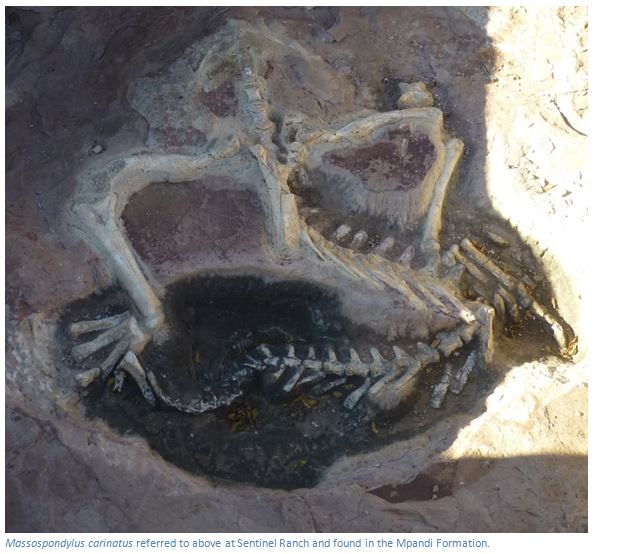 The article goes on to say that the Mpandi Formation consist of red silty clay stones and siltstones that preserve silicified root casts, small carbonate nodules and hematite-coated prosauropod bones which occur in isolated exposures along the banks of the Limpopo River and accumulated on an ancient semi-arid Floodplain. Widespread exposures occur on Sentinel Ranch with a particularly interesting site which has a nearly complete and articulated Massospondylus specimen.