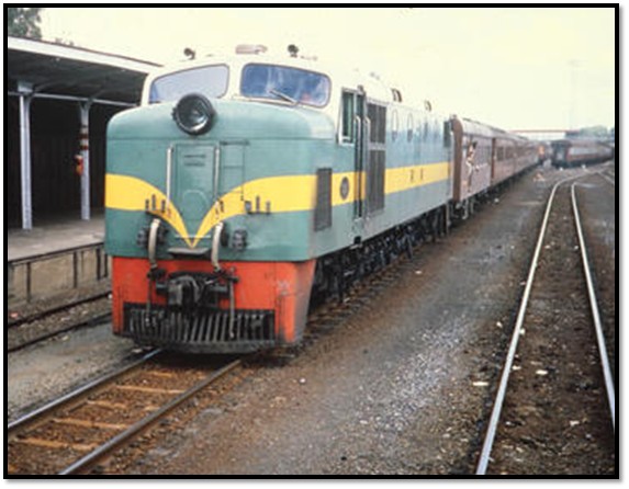Mafeking, 1980. RR Class DE2 with passenger train at station platform.
