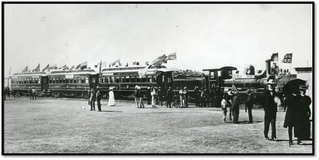 The first train arrived at Salisbury from Umtali on 22 May 1899. The locomotive is Mashonaland Railways No. 1, named “Cecil J. Rhodes” and is a wood-burning ex Cape Government Railways 4th class converted ‘Joy.’