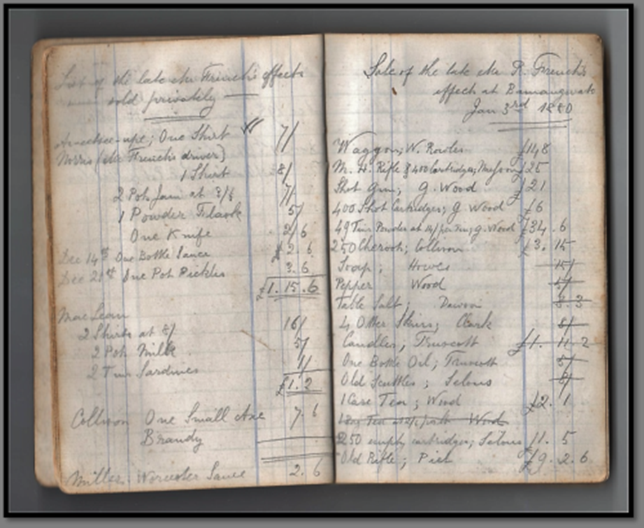 In November they returned to Old Bulawayo before leaving Matabeleland. Selous sold French’s effects to many of the traders in Matabeleland and Bechuanaland keeping detailed records of what was sold to whom, and what was paid and still owed.