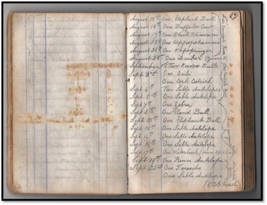 In the preface to A Hunter’s Wanderings in Africa Selous writes: “At the end of the book I have appended some lists kept during my last two hunting expeditions. This has not been done out of any wish to show what a large bag I have made; but it has been copied from my game book, kept carefully from day to day…[iii]