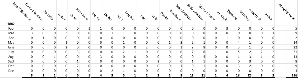From one end of the original game book that Selous kept between these years are daily details of the animals he shot and until 1880 even their location. In 1881 he missed the winter hunting season as he travelled to England. The daily count continues again from 1882, but without locations being noted and stops after the first few months of 1885 – although he continued to collect game specimens for museums.