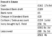 Once a list of French’s effects were made, the next item was to settle amounts due to his servants and driver Norris; details are contained within Selous’ game book.