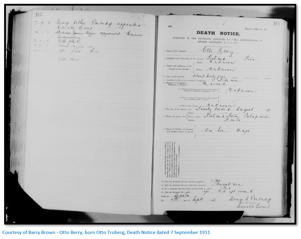 The other unmarked grave belongs to Otto Berry, whose name I discovered whilst researching Pioneer memorial crosses and whose name is listed in "Mrs Holland's book". However the following information was kindly given to me by Barry Brown who sent me an email which I have copied with small additions.