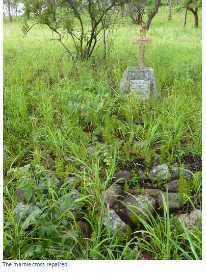 A second visit in February 2016, gave Brent Barbour and I the opportunity to meet Finland Farm’s new owner, Solomon Moyana, to ask him if we could clean up the inscription and re-fix the cross with white marble adhesive putty I had brought to which he readily agreed and even accompanied us to the gravesite and assisted in every way.