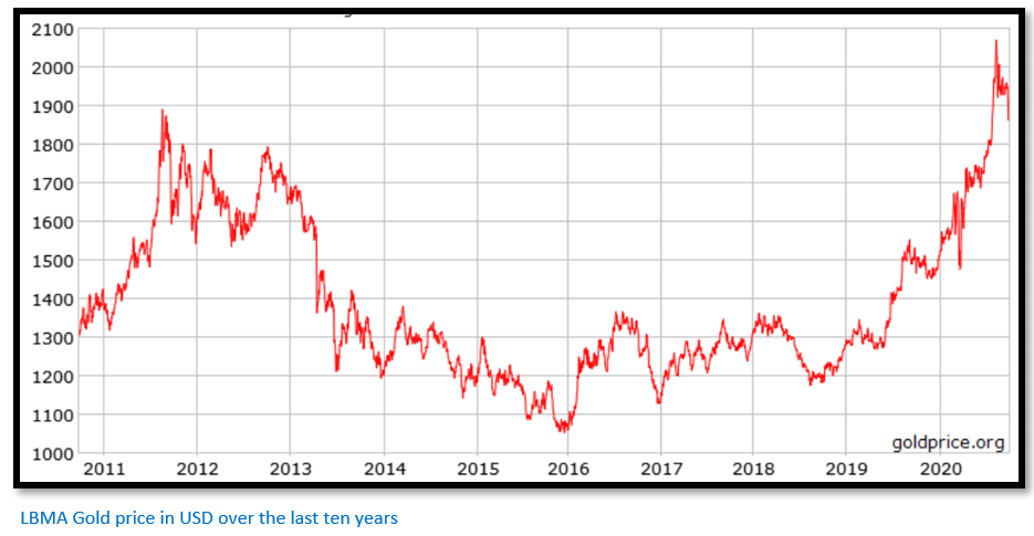 The 2019 decline in gold production is attributed by the Reserve Bank of Zimbabwe (RBZ) to power shortages, a lack of mining equipment and leakages from the gold supply chain to the illicit gold trade. To some extent the rise in gold prices has served to mitigate the decline in production. [See LBMA gold price chart above] Some economists also attribute delays in payments for gold deliveries by FPR as another factor mitigating gold delivery via the legal route as illicit buyers pay immediately in cash.[xviii]