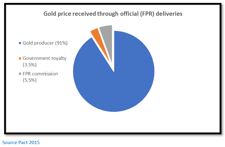 FPR buys all gold on a ‘no questions asked’ policy and does not discourage agents from buying from artisanal miners in order to combat the illicit gold trade. This may contribute to capturing more of the artisanal gold output, but the Pact 2015 report found: “Almost half of miners were unaware of the FPR price for gold, but only 35 percent were unaware of the informal price for gold—suggesting that miners engage more often with informal traders than in the formal system. That said, 65 percent of miners asserted that they sold their gold on the formal market (i.e. to FPR and millers), nearly twice the 35 percent who admitted to selling on the informal market (i.e. to traders, claim owners and sponsors) Thus it can be estimated that between 35 and 50 percent of miners sell their gold on the formal market, with 130 kilograms (about 287 lbs) going to FPR each month. By extension, an estimated 130 to 240 kilograms (about 529 lbs) of gold reaches the informal sector each month.”