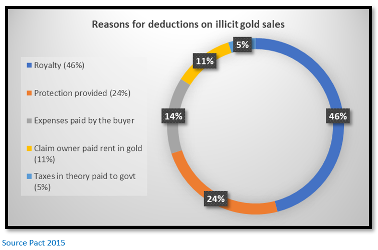 The Pact 2015 study revealed that 52% of artisanal miners said deductions were made when they sold their gold to illicit buyers (48% had no deductions made) These deductions might be for milling and transport, food and operational costs including protection and royalties for the gold claim rights.