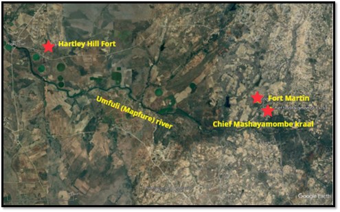[29] The distance from Hartley Hill Fort to the Umfuli (Mupfure) river at its nearest point is 1,840 yards (1,680 metres) so clearly the Chimbo stream 470 yards (430 metres) away was their water source and must still have had pools of water in mid-winter.