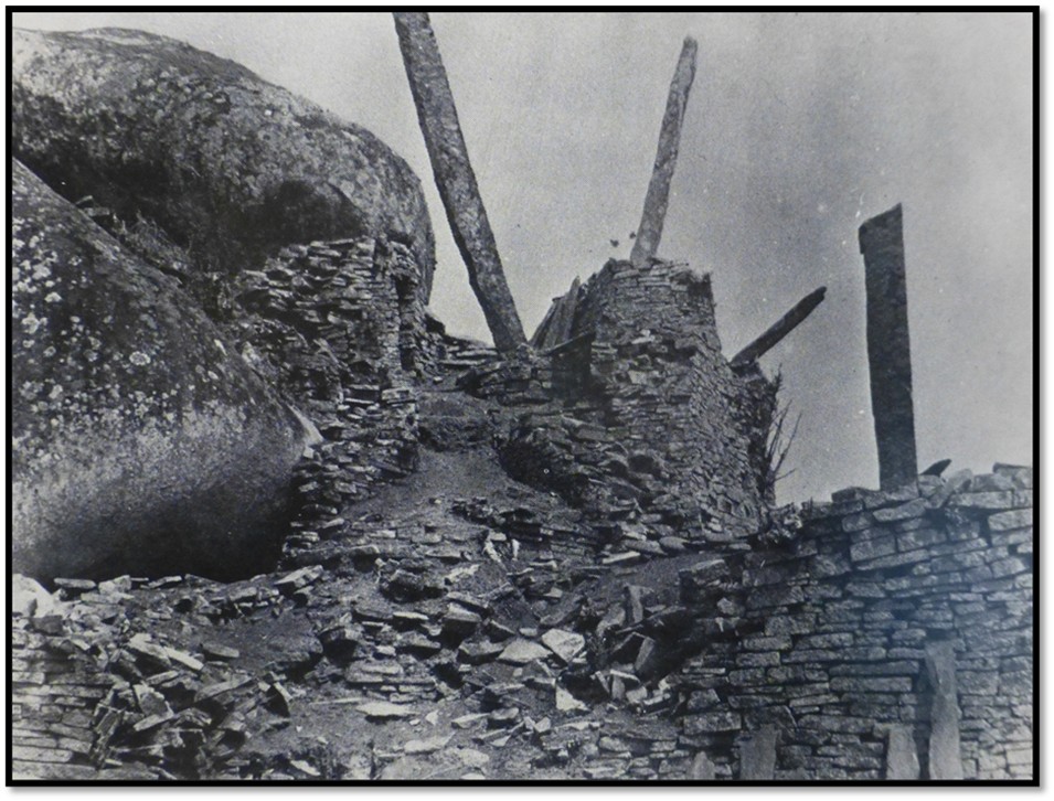 At the eastern end of the Hill Complex is the Eastern Enclosure. Garlick writes that the south wall was once capped by a dentelle patterned frieze. Inside the enclosure the ground slopes steeply upwards and in 1890 was strewn with a jumble of fallen stone blocks. The area was probably originally terraced to support groups of circular stone platforms each holding some of the considerable number of monoliths that were found in this enclosure including some of those with the soapstone birds. A narrow passage leads from the eastern enclosure up between rocks to the flat top of a large boulder that was surrounded by three walls to form the highest enclosure on the hill, ‘the balcony’ overlooking the eastern enclosure and the valley below.[14]