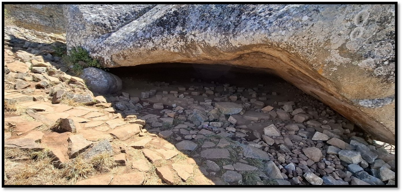 The small cave above the Recess (E) / Southern Enclosure (F) that may have been used by the spirit mediums or an oracle to communicate with the ancestors and has the remarkable acoustic property of transmitting words spoken in a normal voice that can be heard 600 metres away in the Great Enclosure provided there is no wind. S.D. Sandes, curator from 1948 – 59 was told about this phenomena by his African staff in 1950 and tested it several times. Undoubtably this acoustic effect played a spiritual part in the siting of Great Zimbabwe.[17]