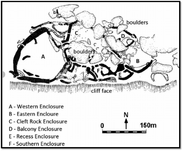 The western enclosure “is bounded by two curved walls over 30 feet (9 metres) high, the most substantial erection on the hill or in the earlier walling style., capped by turrets and monoliths. The interior of this enclosure originally had an uneven rock floor but before the building of the wall started this was levelled off with dhaka brought up from the pits around the base of the hill. As dhaka structures were built, decayed and were demolished to allow for renewed building, this enclosure filled up with deposits that finally reached a depth of 14 feet (4.3 metres) It is five times the size of any other enclosure on the hill and had room for about fourteen dhaka dwelling huts.”[8]