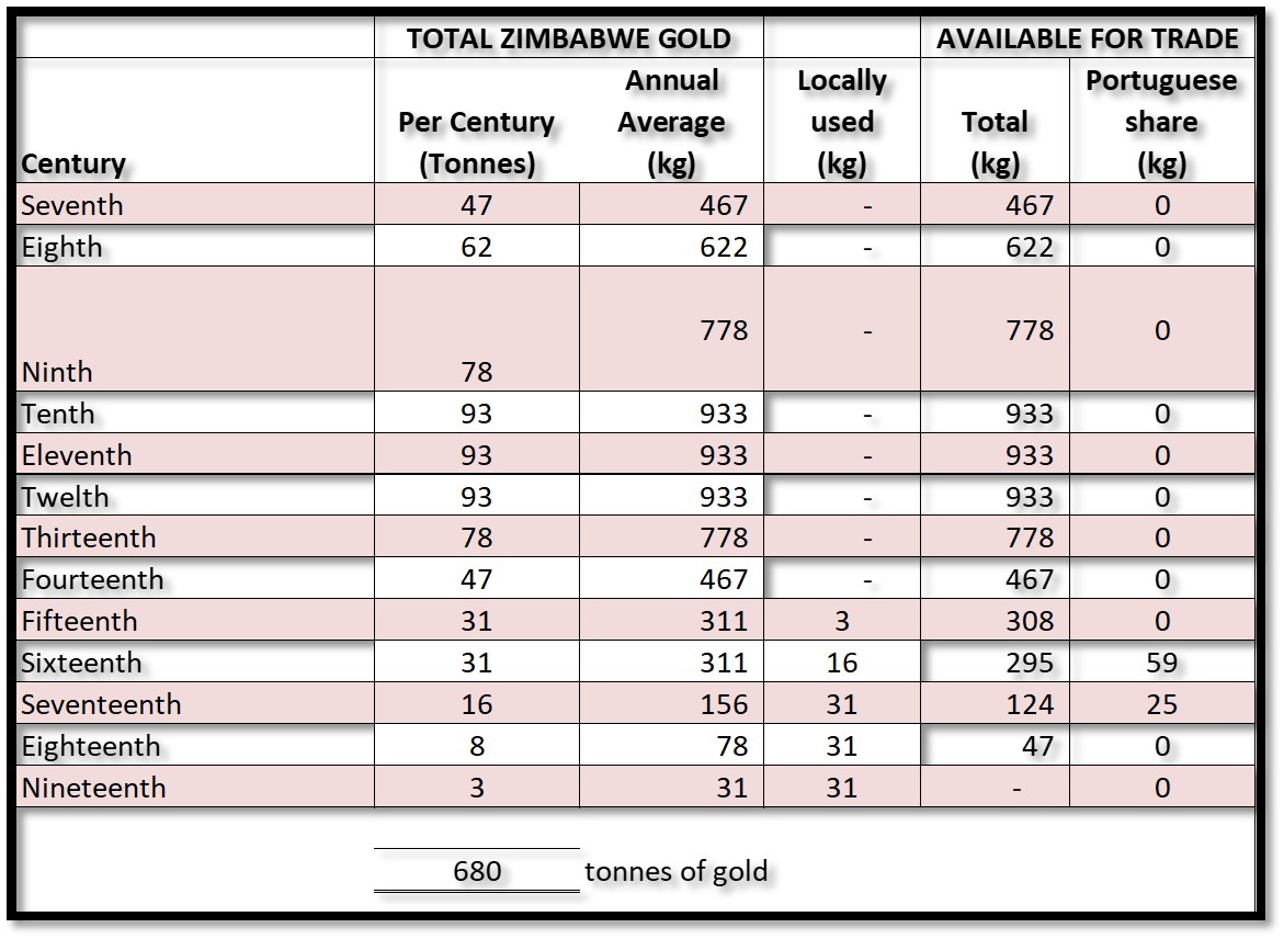 Source: R. Summers Ancient Mining in Rhodesia (converted from troy oz. to kg)