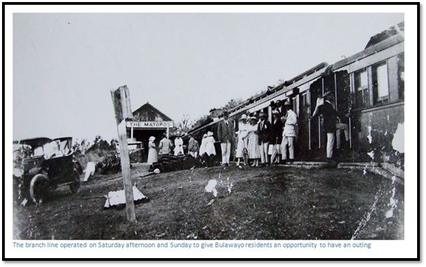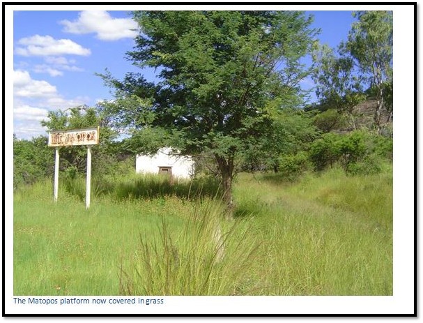 The platform survives along with a piece of railway track the length of the platform and the original buffer, the corrugated iron shed with its wooden door, the platform sign with “THE MATOPOS” and the Memorial erected by The Historical Monuments Commission in conjunction with The Rhodesia Railways Historical Committee.  The plaque reads: “MATOPOS BRANCH LINE. This plaque marks the site of the railway terminus of the Matopos branch line opened 04th November 1903; closed 1st June 1948. The 9 mile line from Westacre Junction was built in accordance with provisions in the will of Cecil Rhodes so that the people of Bulawayo may enjoy the glory of the Matopos from Saturday to Monday.” In later years, however, this branch line only operated on Saturday and Sunday afternoons to permit Bulawayo residents a picnic outing.