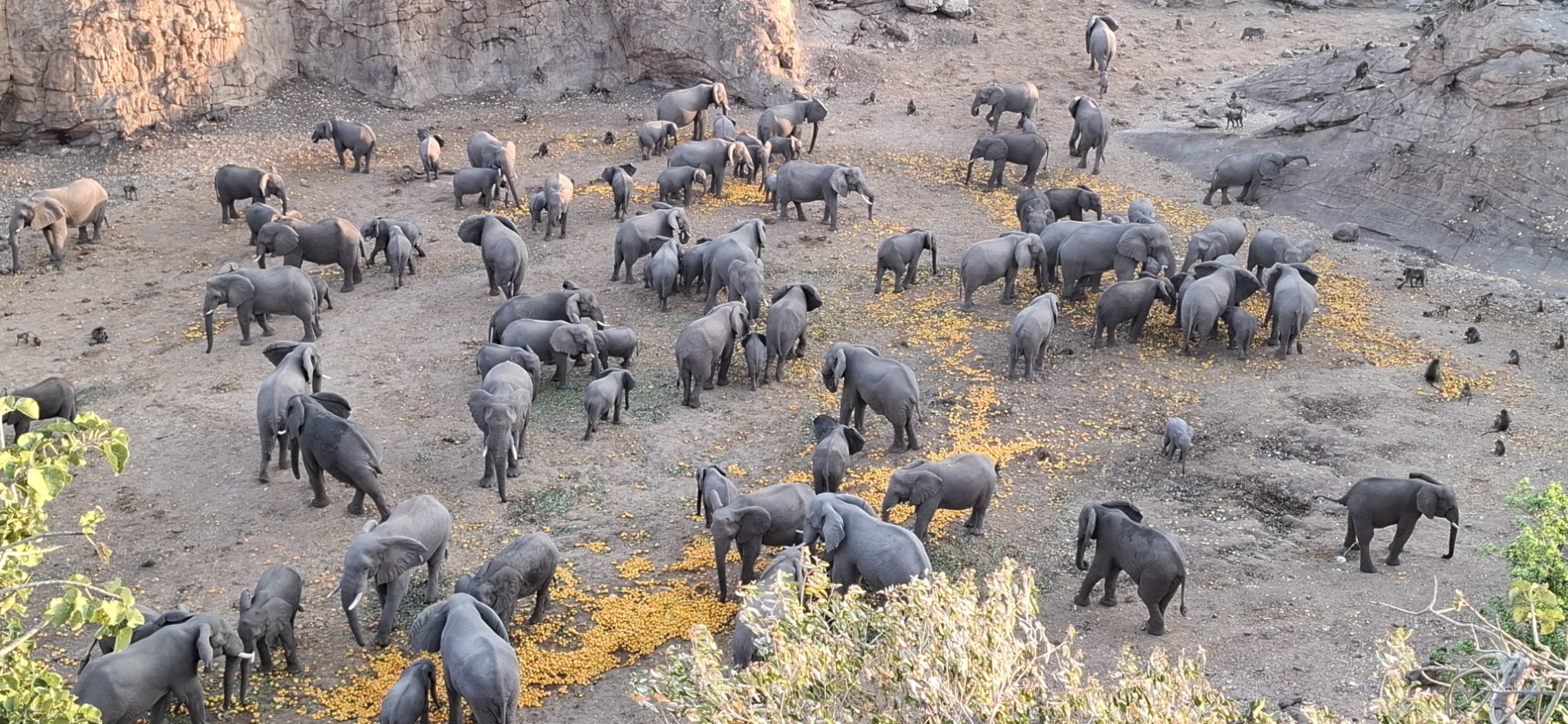 - A truly amazing experience to watch the elephants, eland, impala and baboon feeding on the orange pulp as the sun goes down. As the darkness descends, the elephants stride in silently, either singly or in small groups, and gather in the artificial light.