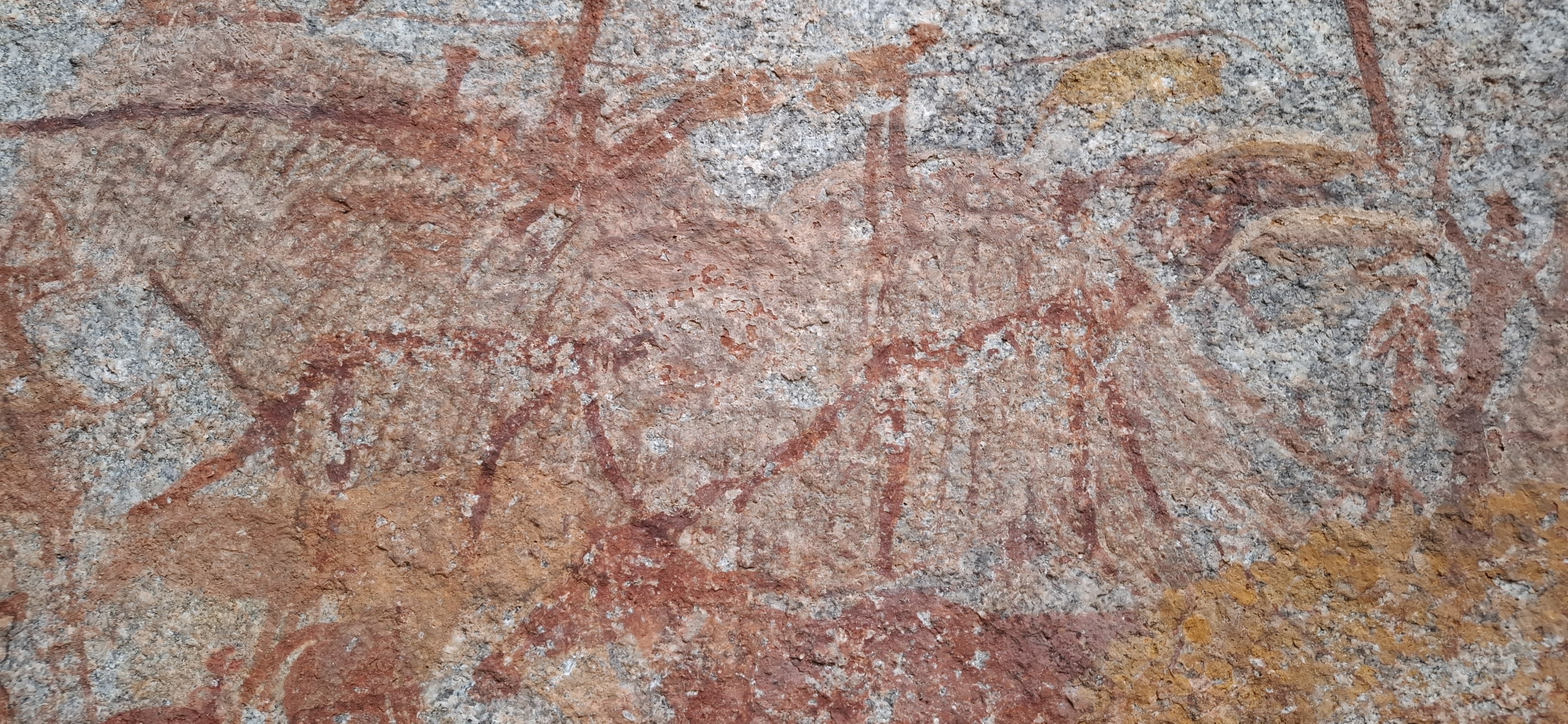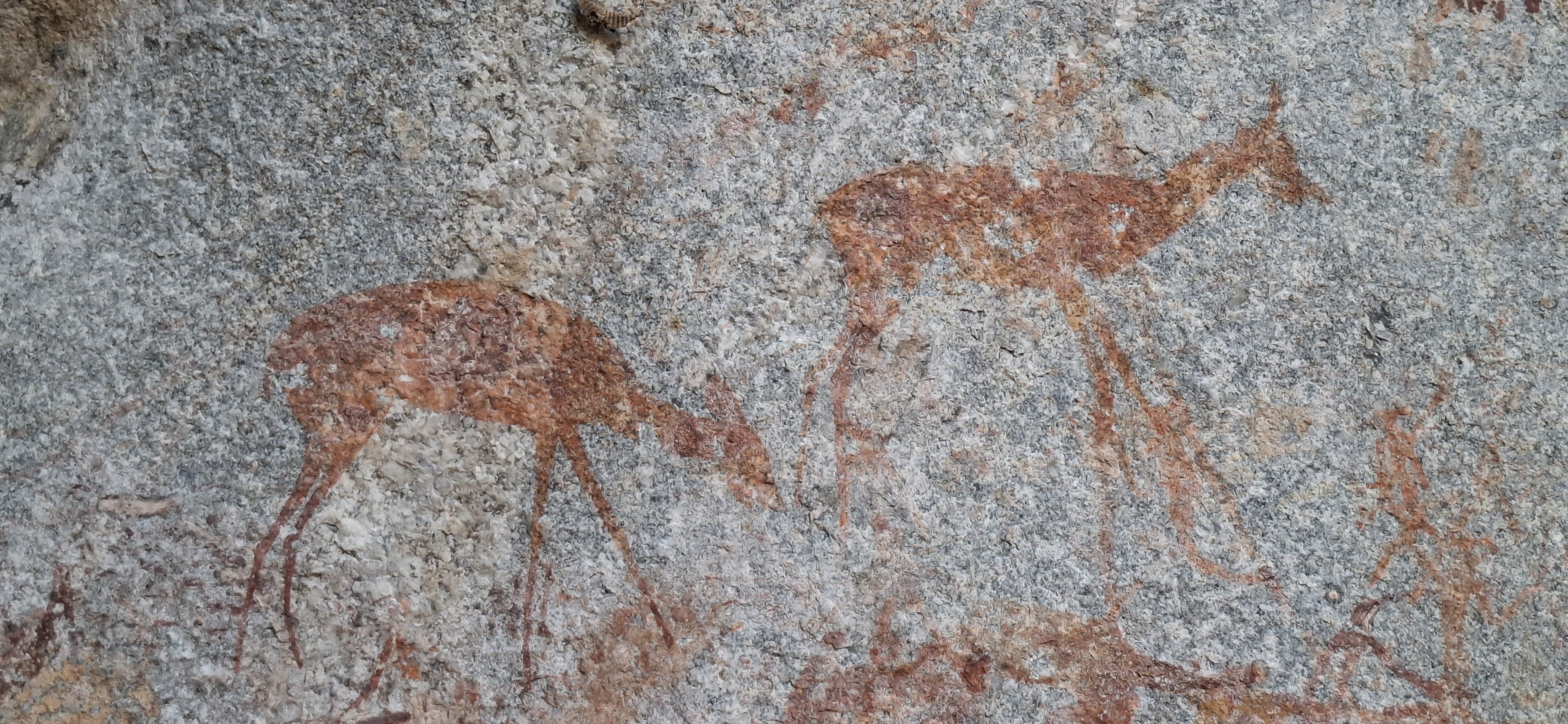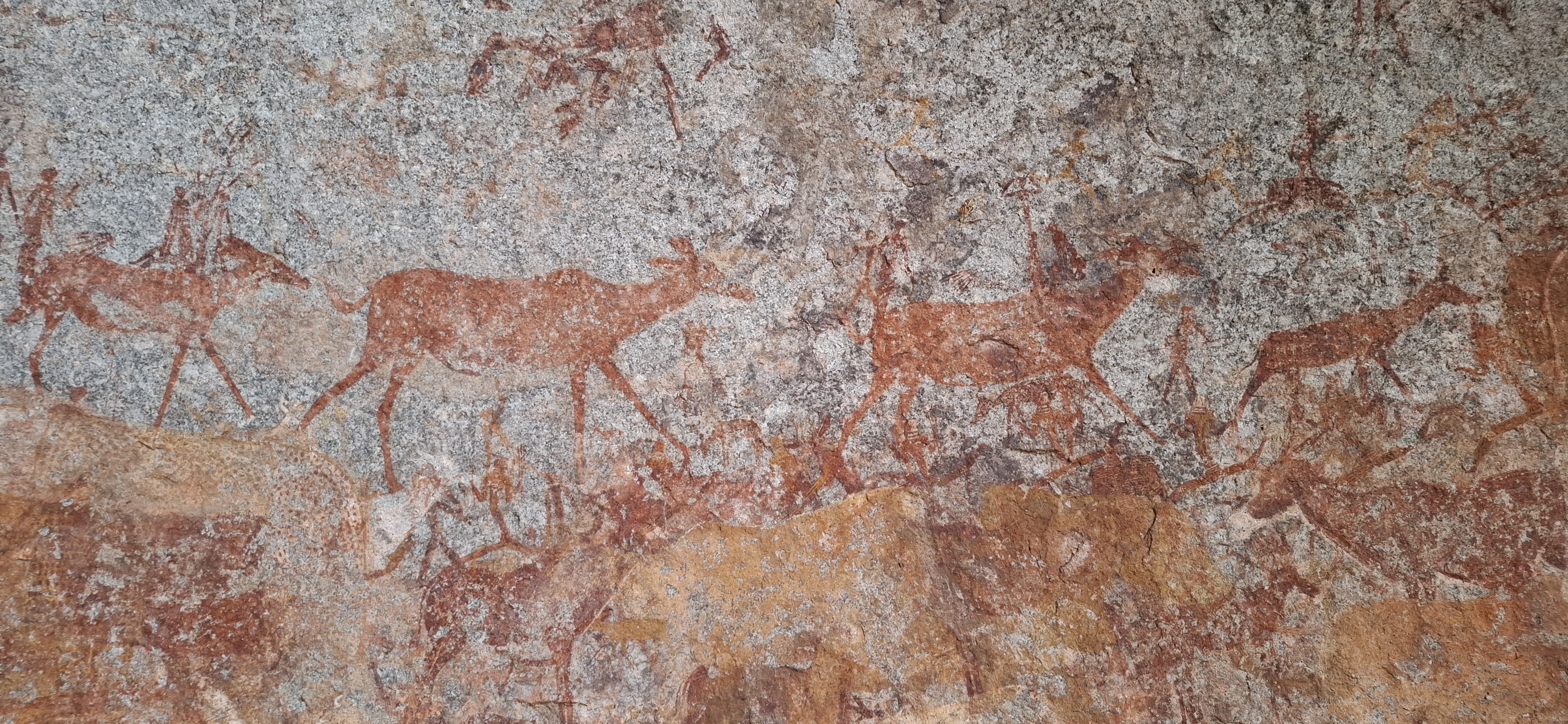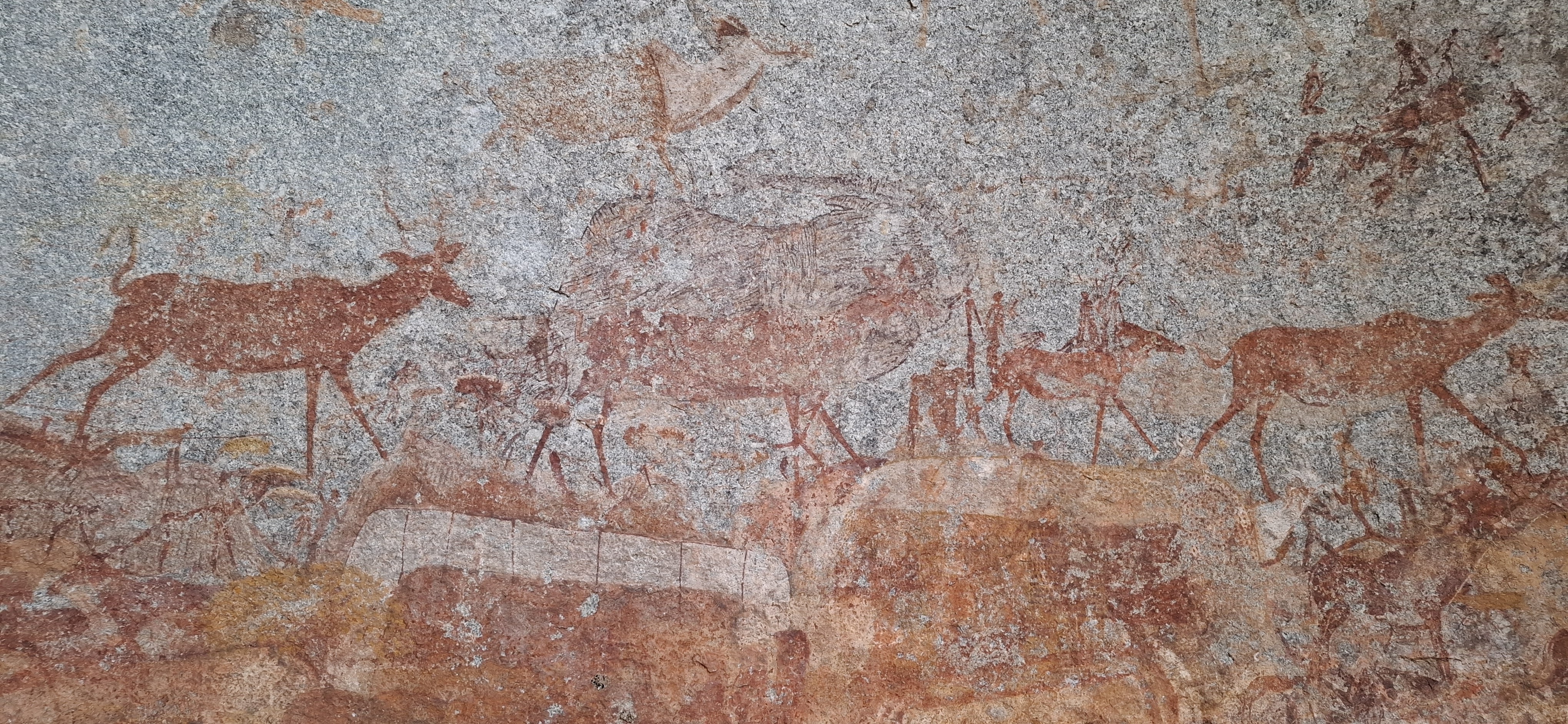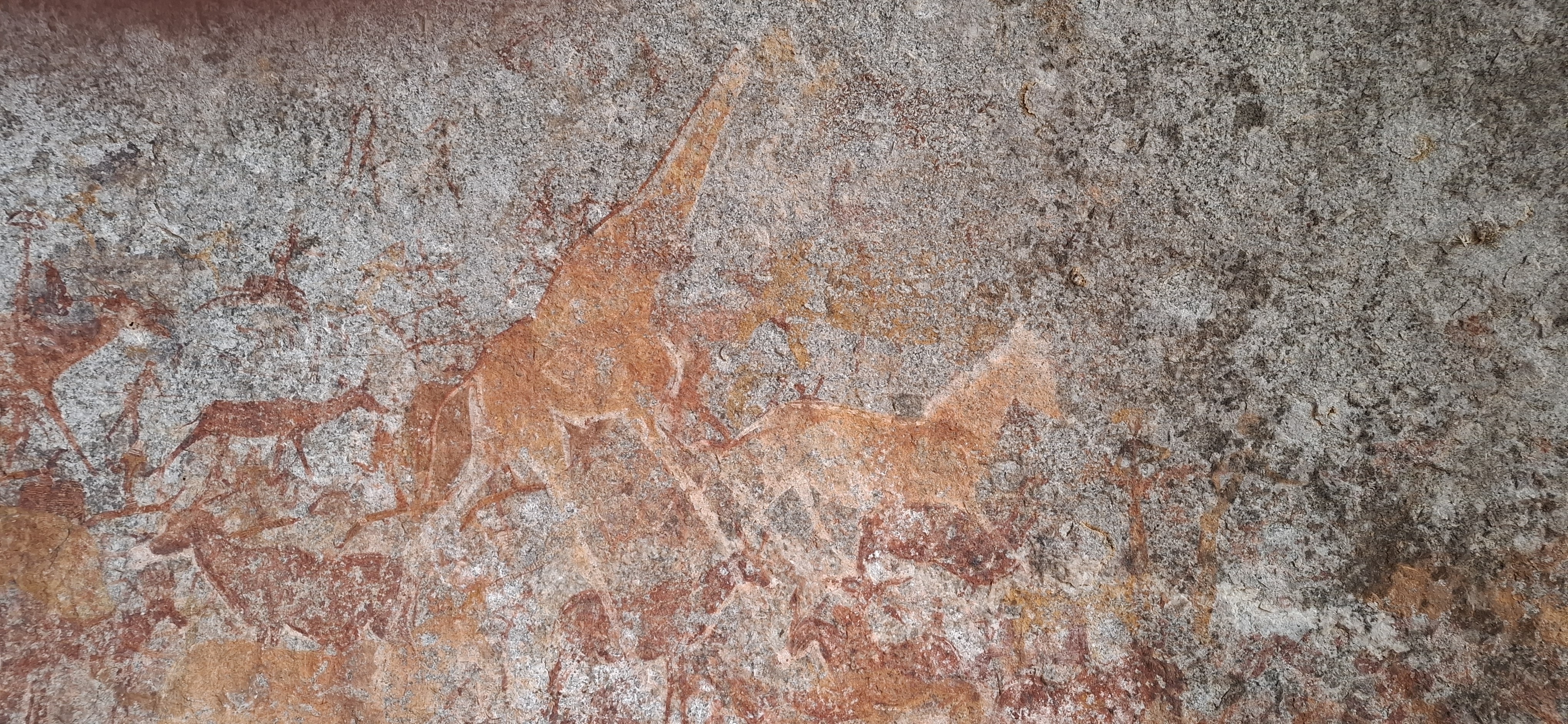 The cave itself is at the end of a narrow gulley with an entrance just 5.5. metres wide, but extends for about 14 metres into the hill. The paintings are mostly red to brown in colour; a giraffe and elephants in light claret, a white rain bull and three of the most beautiful polychrome giraffes to be found anywhere in the country.