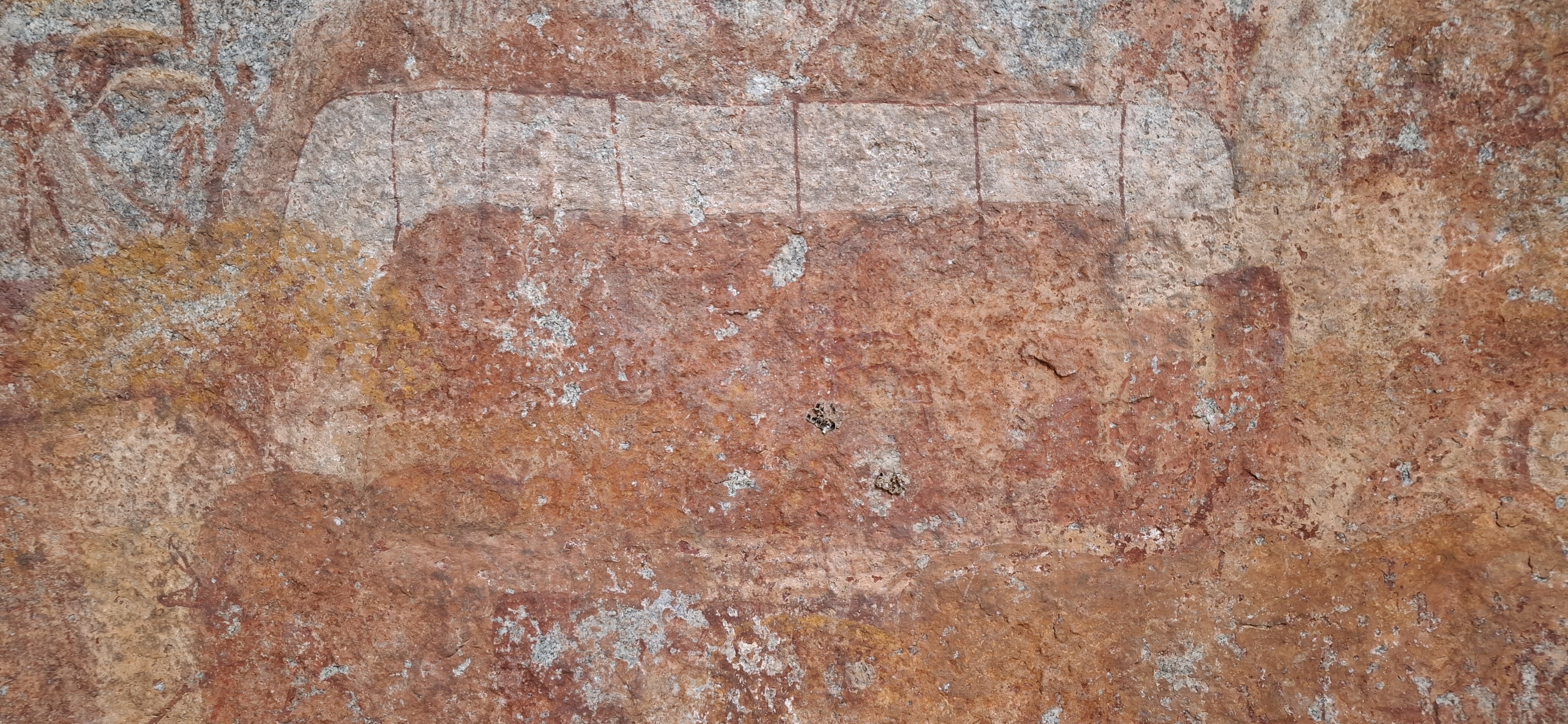Below the main frieze are a number of ovoids in ochre and red with stippling and white caps. Low left are two shapes with multiple parallel lines in a semi-circle enclosing a lenticular-shaped object. There are fragments of stripling visible beneath.