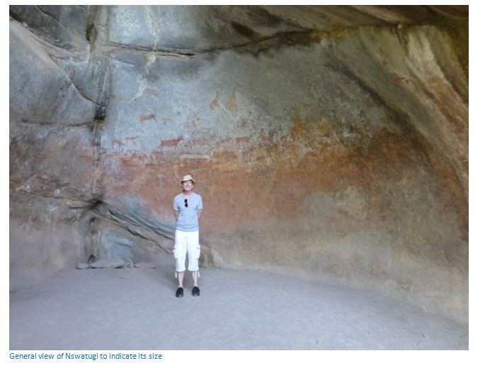 From the National Park Reception head towards Maleme Dam, 1.7 KM turn left at the junction facing the Dam and cross the wall, 3.7 KM reach road junction and turn right to go north. The signpost says 7 km but it is much better to stop at 1.6 KM where the signpost on the left indicates Nswatugi Cave and walk the path rather than driving the long way around to the Site car park on a track that is in very poor condition. The climb is quite short and easy along a well-marked path marked on the granite with green arrows.