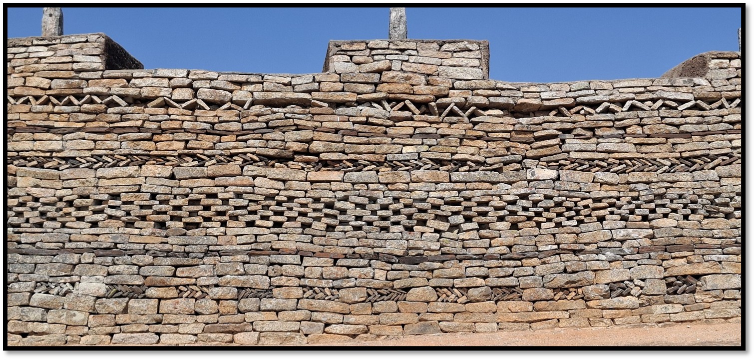 The central platform is composed of large stones bound together with several thick horizontal layers of dhaka strengthened with wooden posts inserted at intervals.